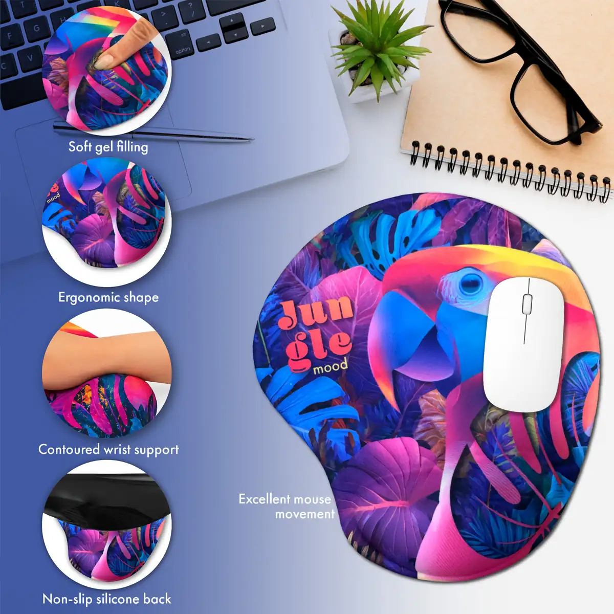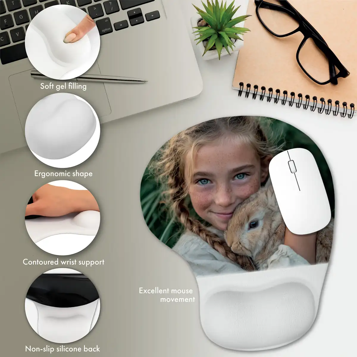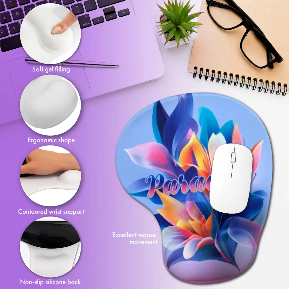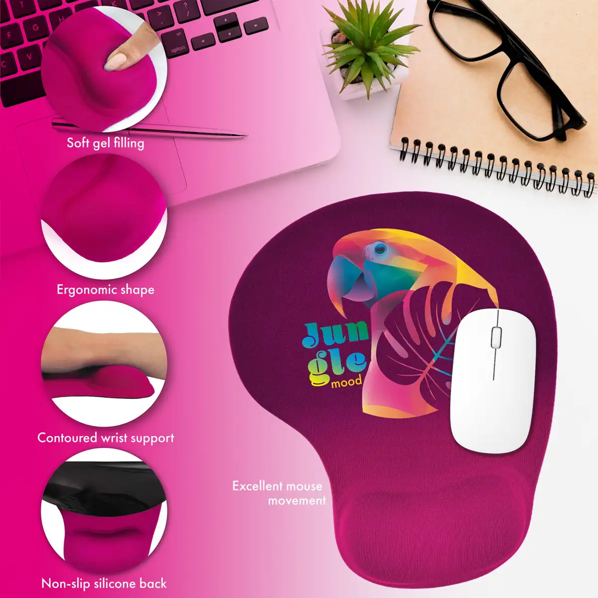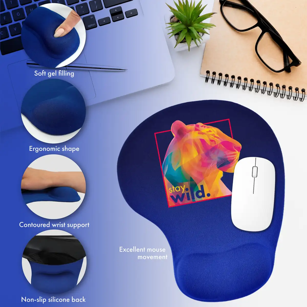 Ergonomia naszych reklamowych podkładek pod myszkę przenika do każdego detalu – od podpórki i antypoślizgowej gumy na spodzie, dzięki której podkładka stabilnie leży na biurku, po idealnie dopasowaną powierzchnię, która zapewnia precyzyjny ruch myszki. W naszych podkładkach pod myszkę dopięte są wszystkie szczegóły idealnie, aby Twój nadgarstek i myszka mogły pracować razem w harmonii.
