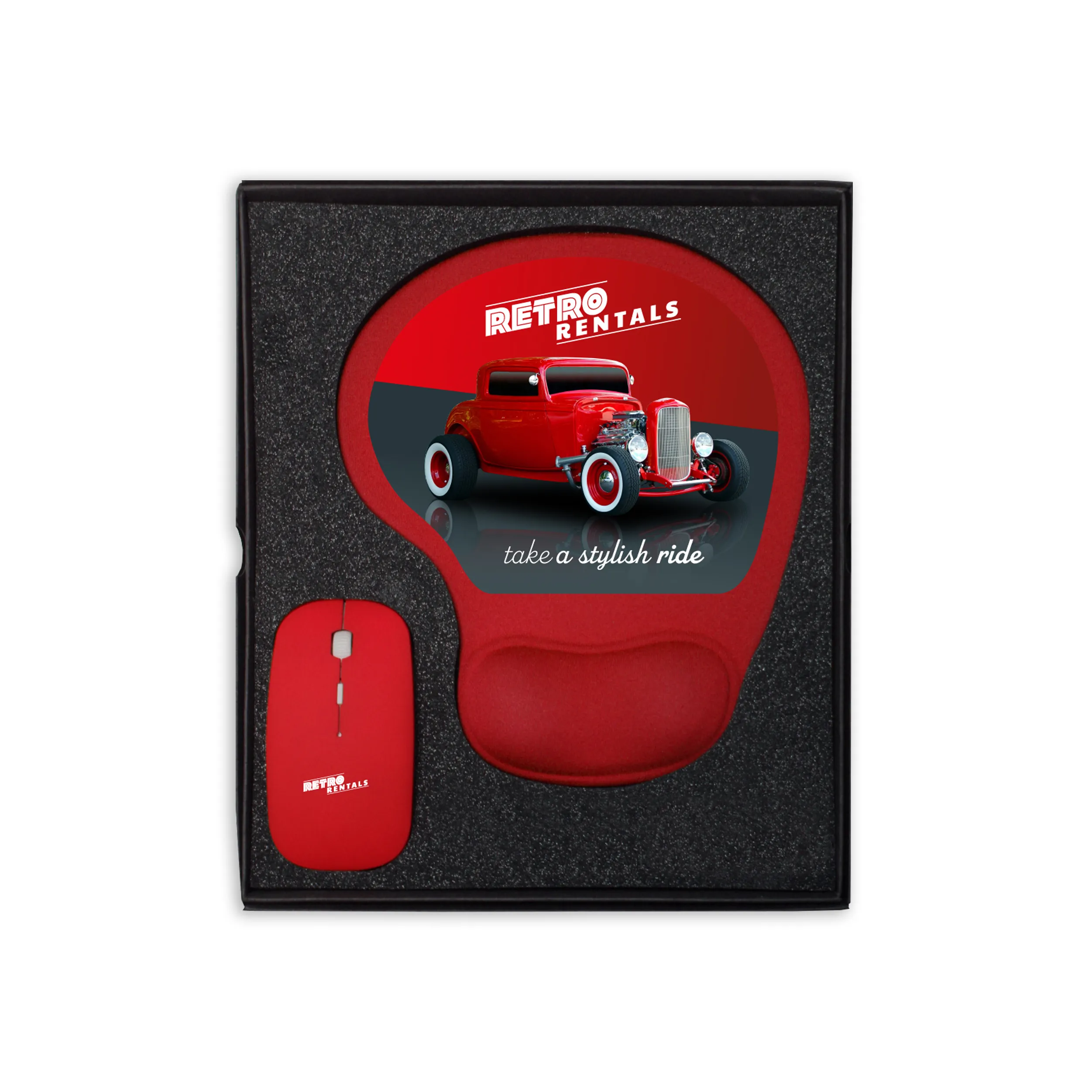 Cadeaux élégants comprenant un tapis de souris ergonomique et une souris d’ordinateur.