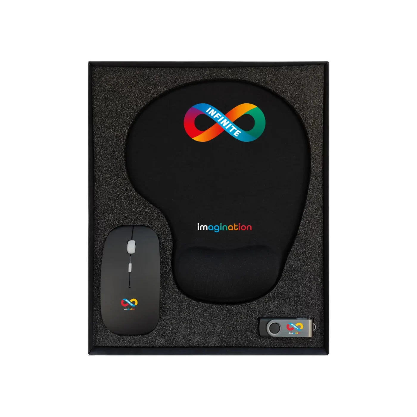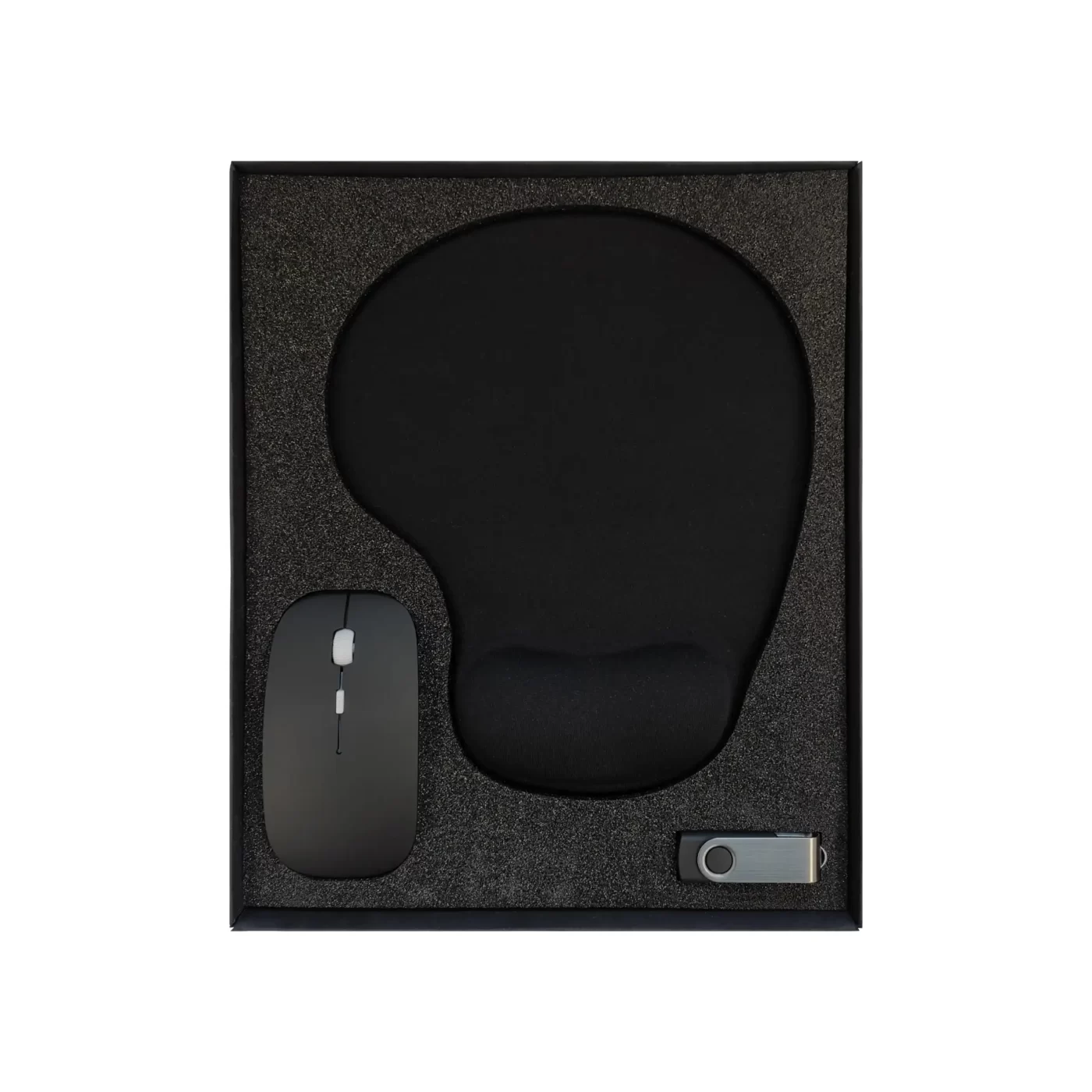 Élégants coffrets cadeaux comprenant un tapis de souris ergonomique, une souris d’ordinateur et une clé USB.
