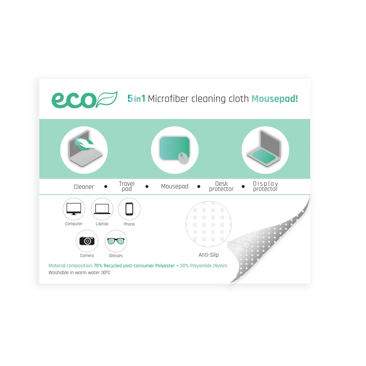 C’est un tapis de souris fabriqué à 70% en Polyester recyclé + 30% Polyamide (Nylon), qui sert également de nettoyant pour écrans ou lunettes, de sous-main de voyage, de protection de bureau et de protection d’écran.