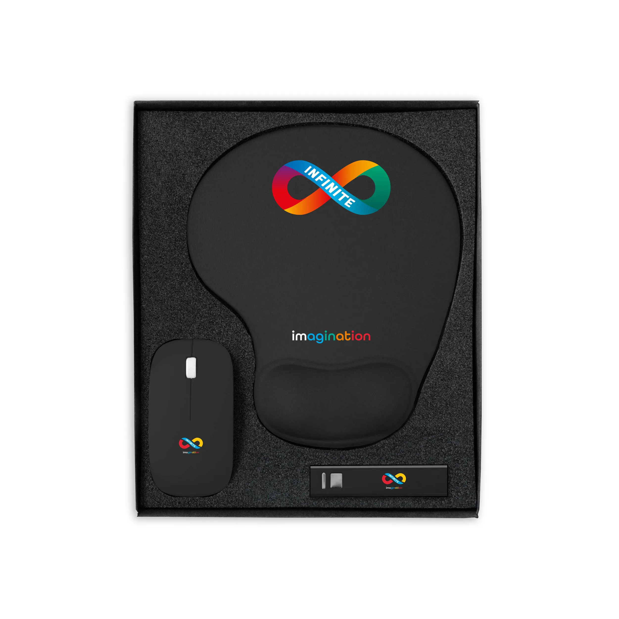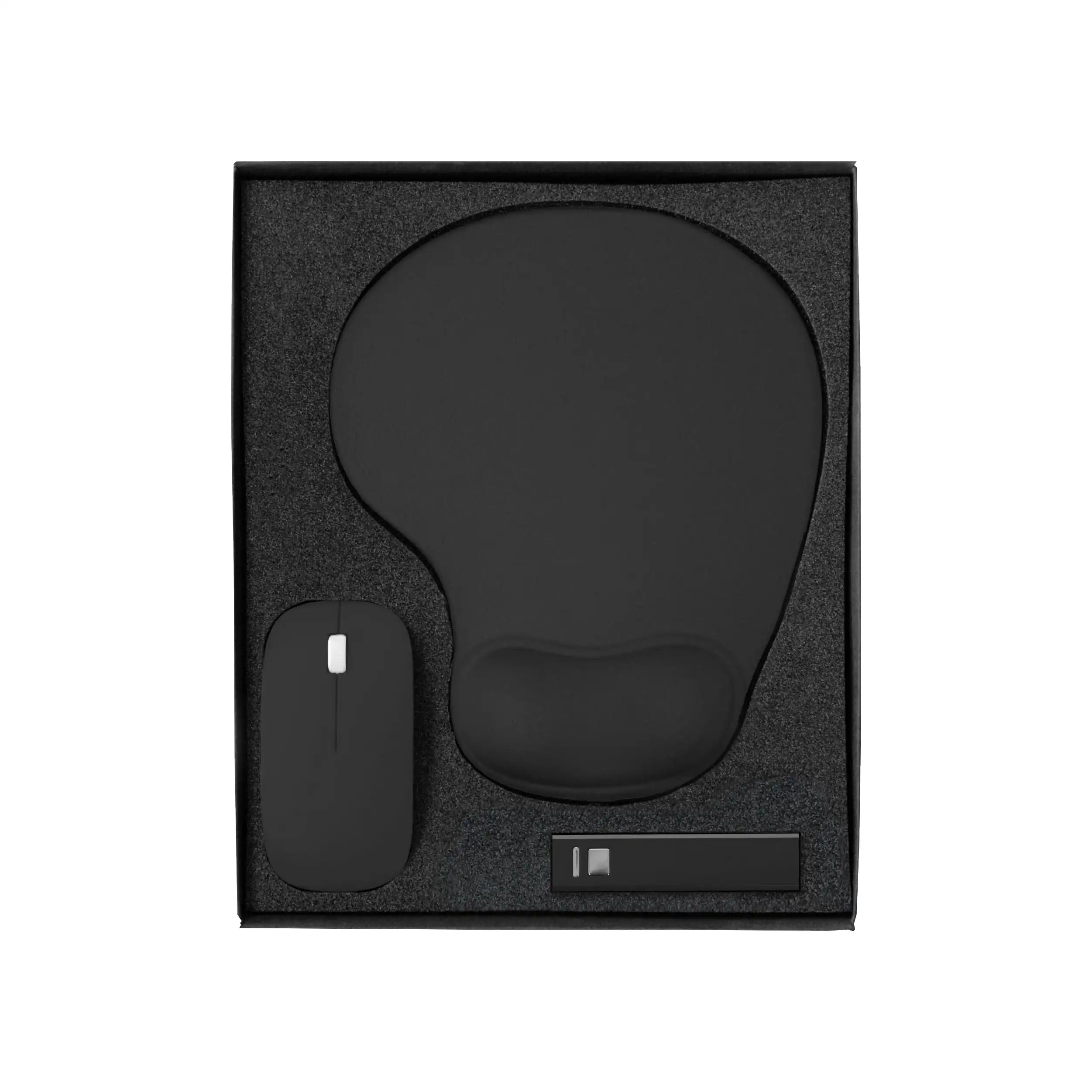 Eleganti set regalo, che includono un tappetino per mouse ergonomico, un mouse per computer e un power bank.
