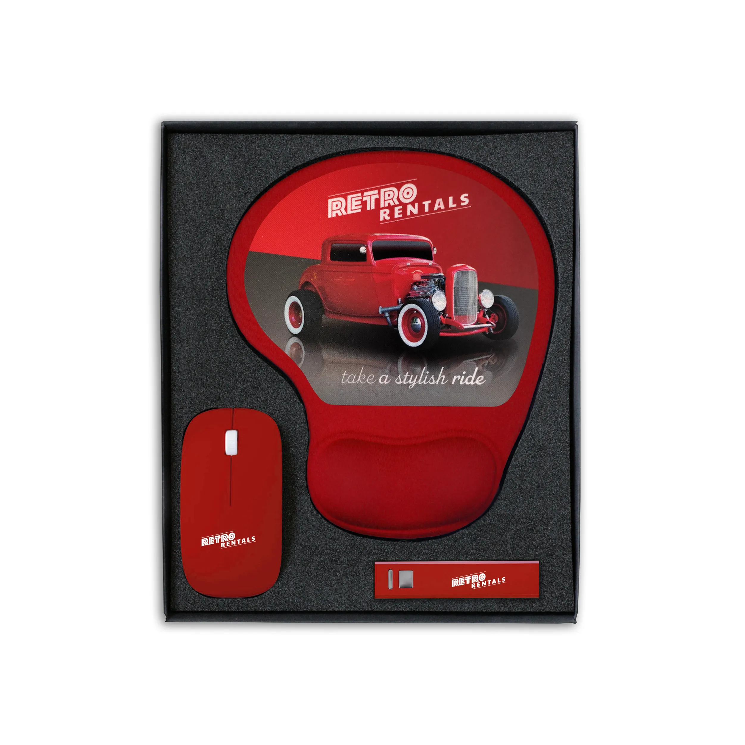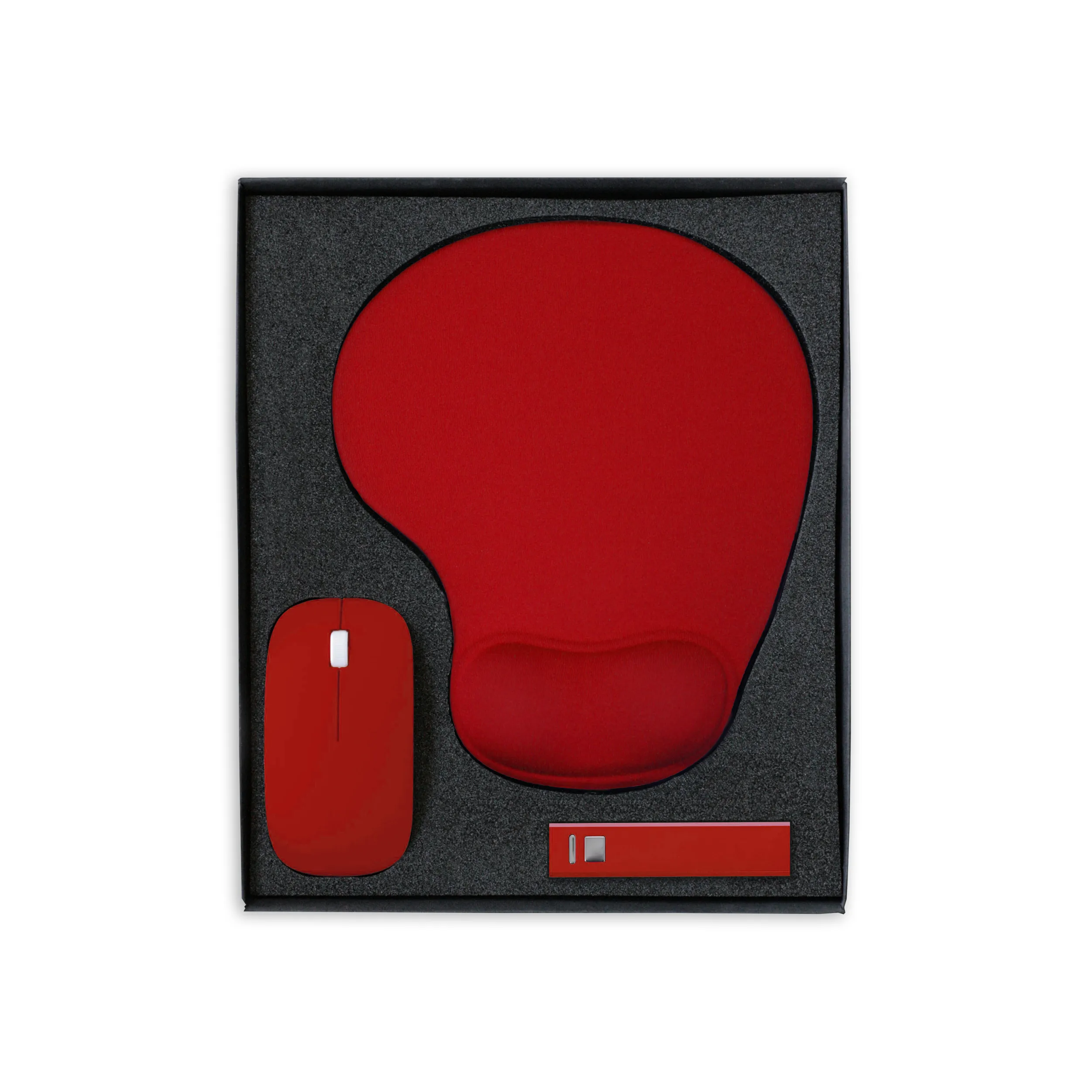Elegantiški dovanų rinkiniai, susidedantys iš ergonominės pelės kilimėlio, kompiuterinės pelės ir išorinės baterijos.