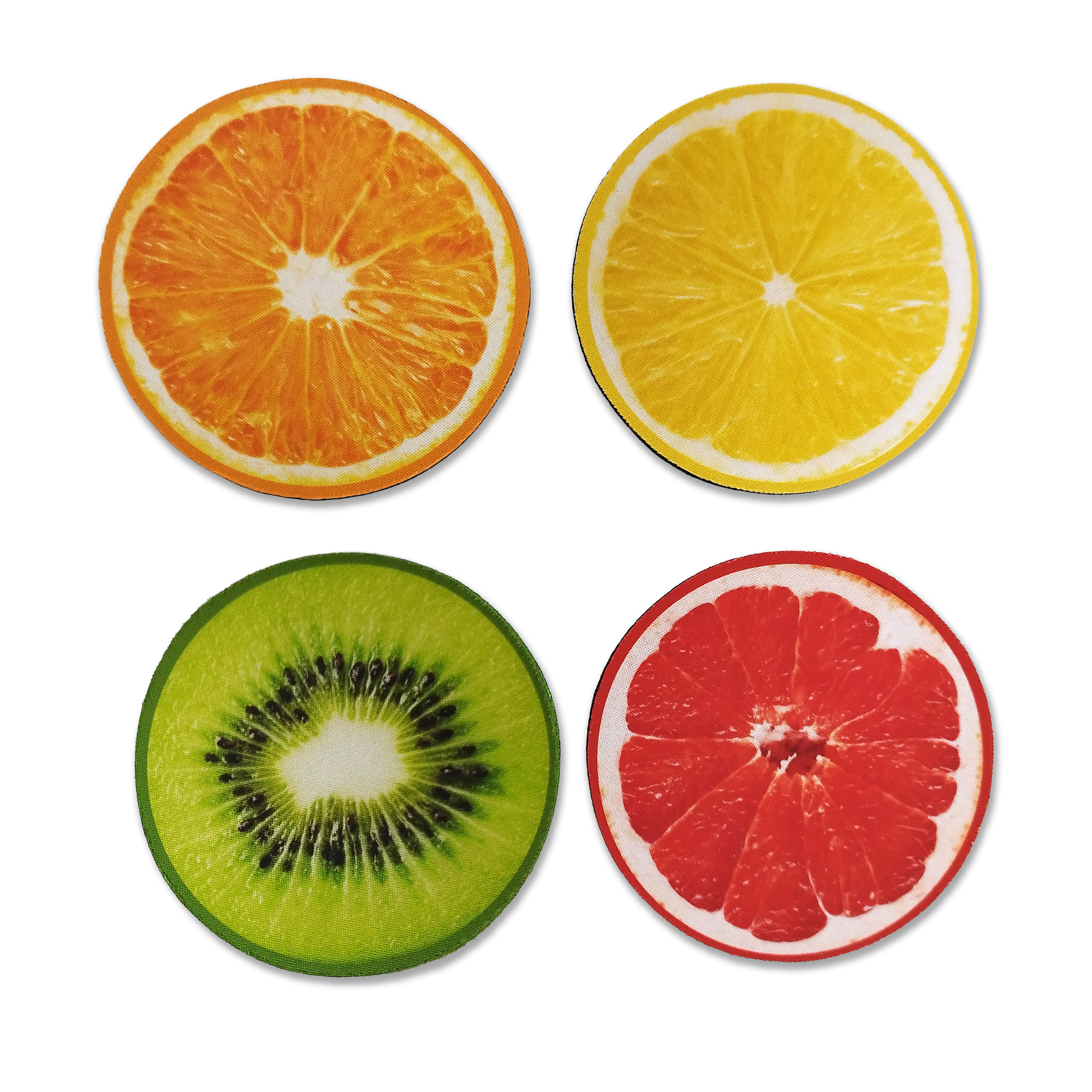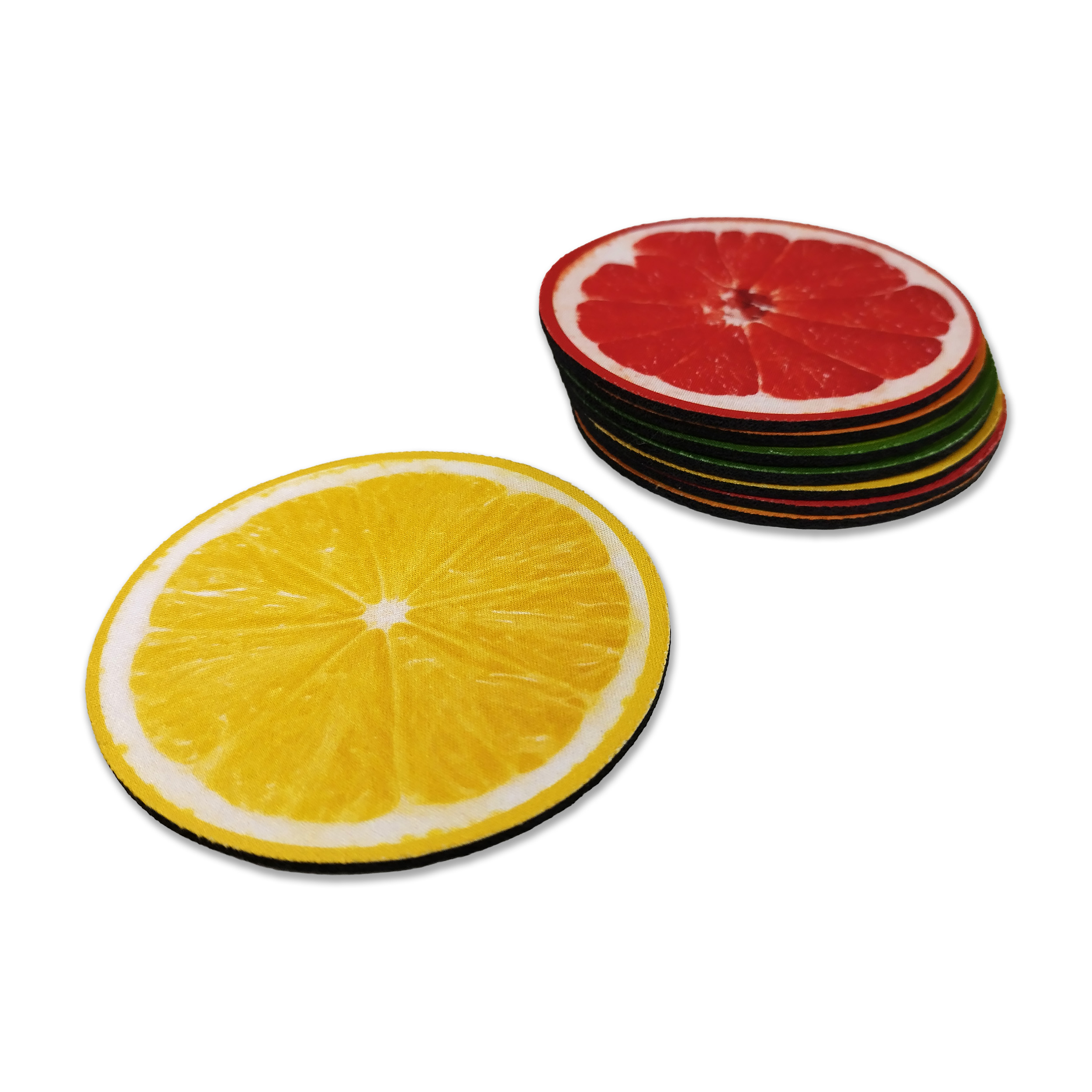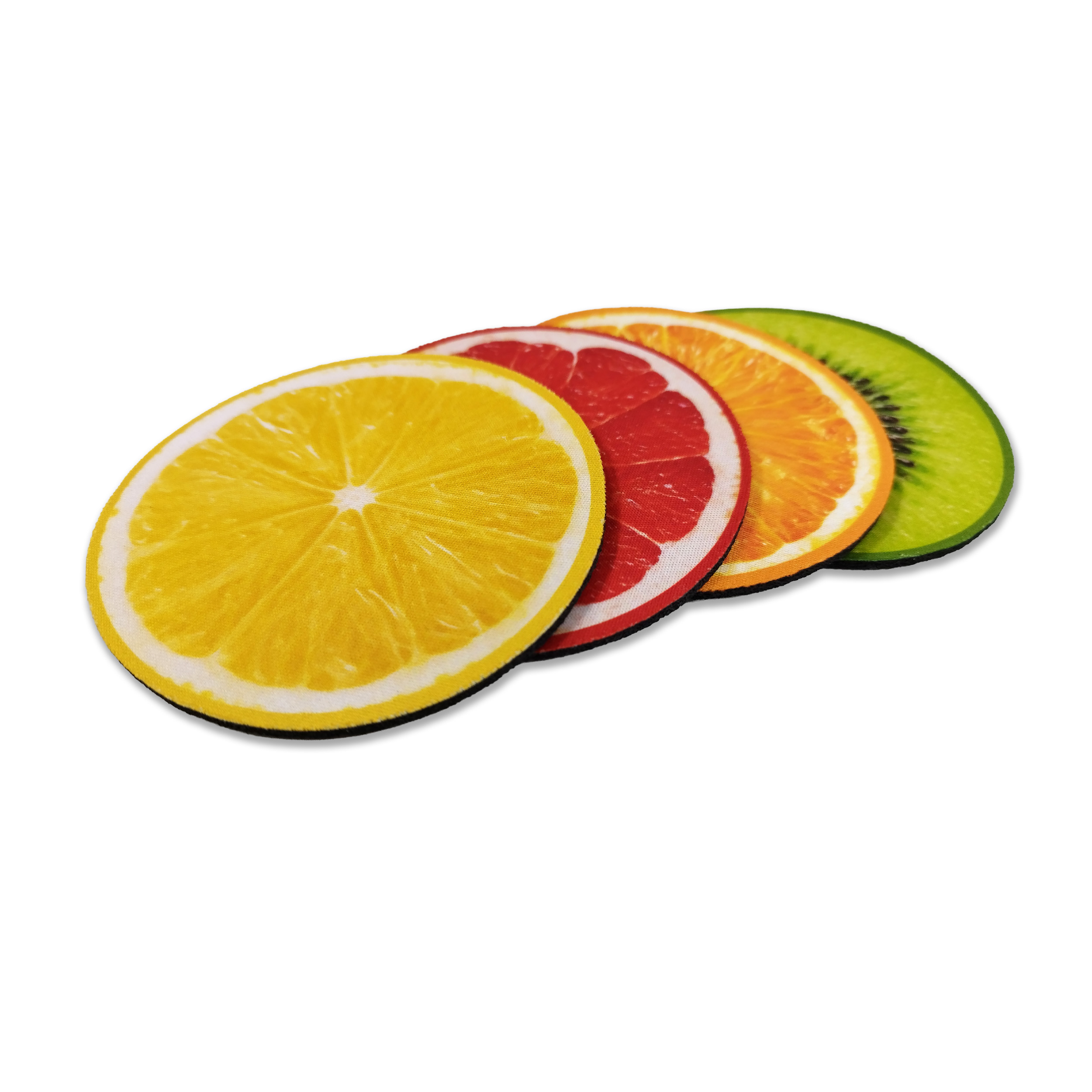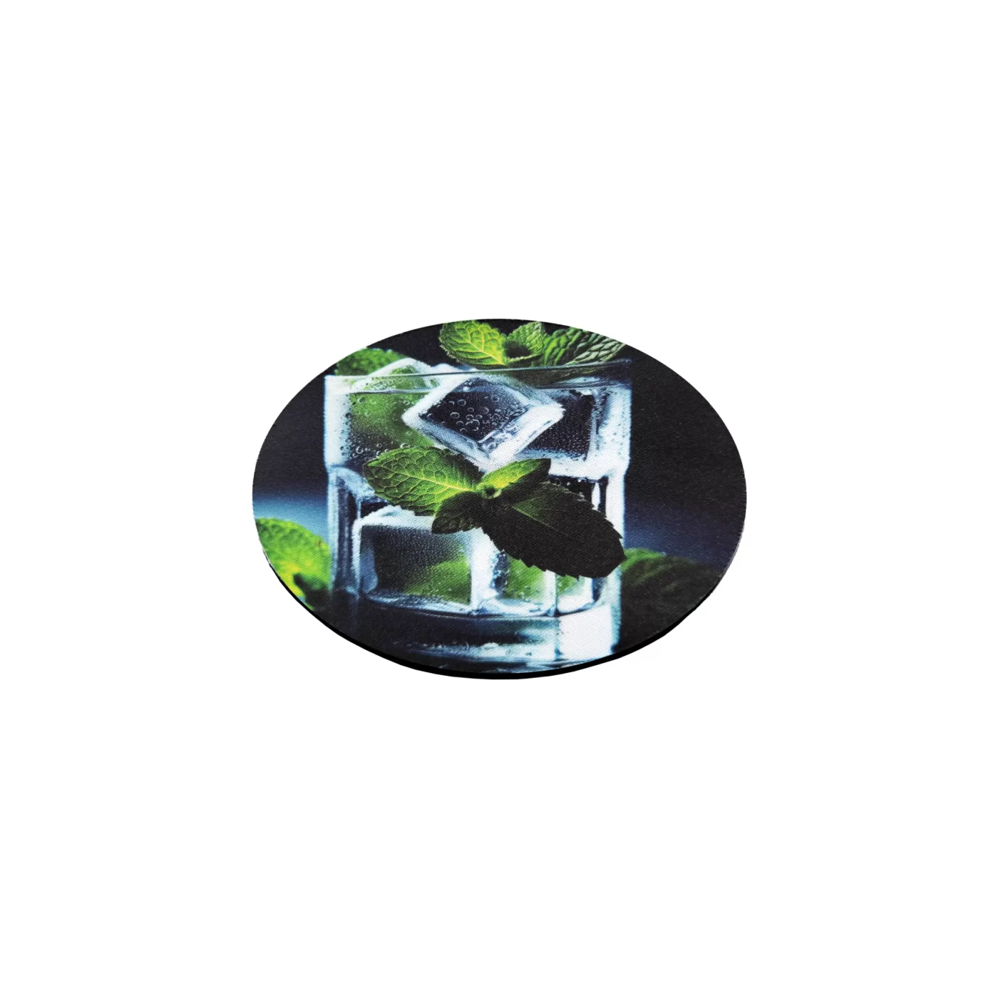 Okrągłe podkładki pod kubek do nadruku sublimacyjnego o średnicy 10 cm. Podkładki mają gumowy czarny podkład i warstwę poliestru na białej tkaninie. Idealnie nadają się na nadruków w najwyższej jakości techniką sublimacji.
